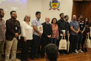 Brasão da UFSC: A parte central do brasão é composta por uma flâmula. Ela é azul na porção superior e amarela na inferior. Sobre o azul, à esquerda, cinco estrelas brancas formam o cruzeiro do sul; à direita, uma faixa branca tem o texto escrito em vermelho: ars et scientia. Centralizada na parte amarela, há uma roda dentada vermelha quebrada na seção inferior. Duas folhas verdes de palma estão encaixadas no eixo da roda. Uma folha pende para o lado direito e a outra para o lado esquerdo. Atrás da flâmula há uma tocha amarela, da qual enxergamos os extremos: acima, com o fogo desenhado em vermelho, e abaixo, a parte inferior do bastão. Do lado esquerdo da flâmula, há um ramo verde de carvalho e do lado direito um ramo verde de louro. A parte inferior do brasão é composta por uma faixa estreita vermelha, escrito em branco: Universidade Federal de Santa Catarina. Abaixo da faixa, escrito em fonte maiúscula azul: UFSC.
